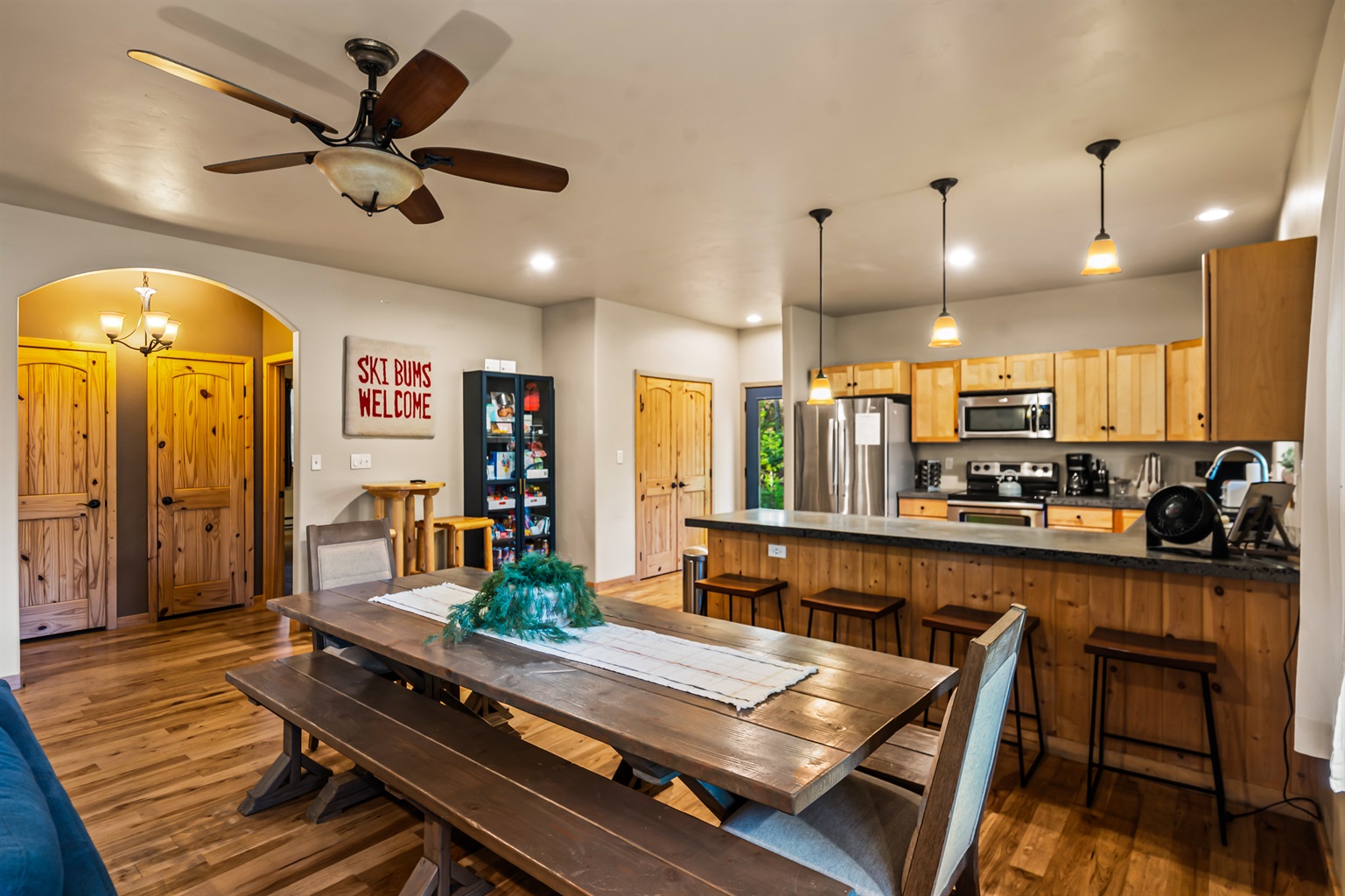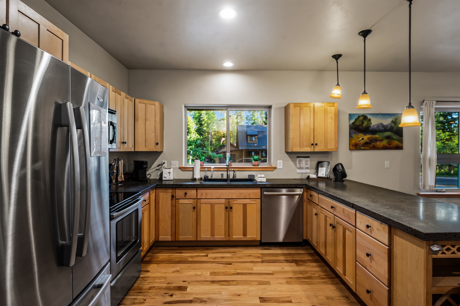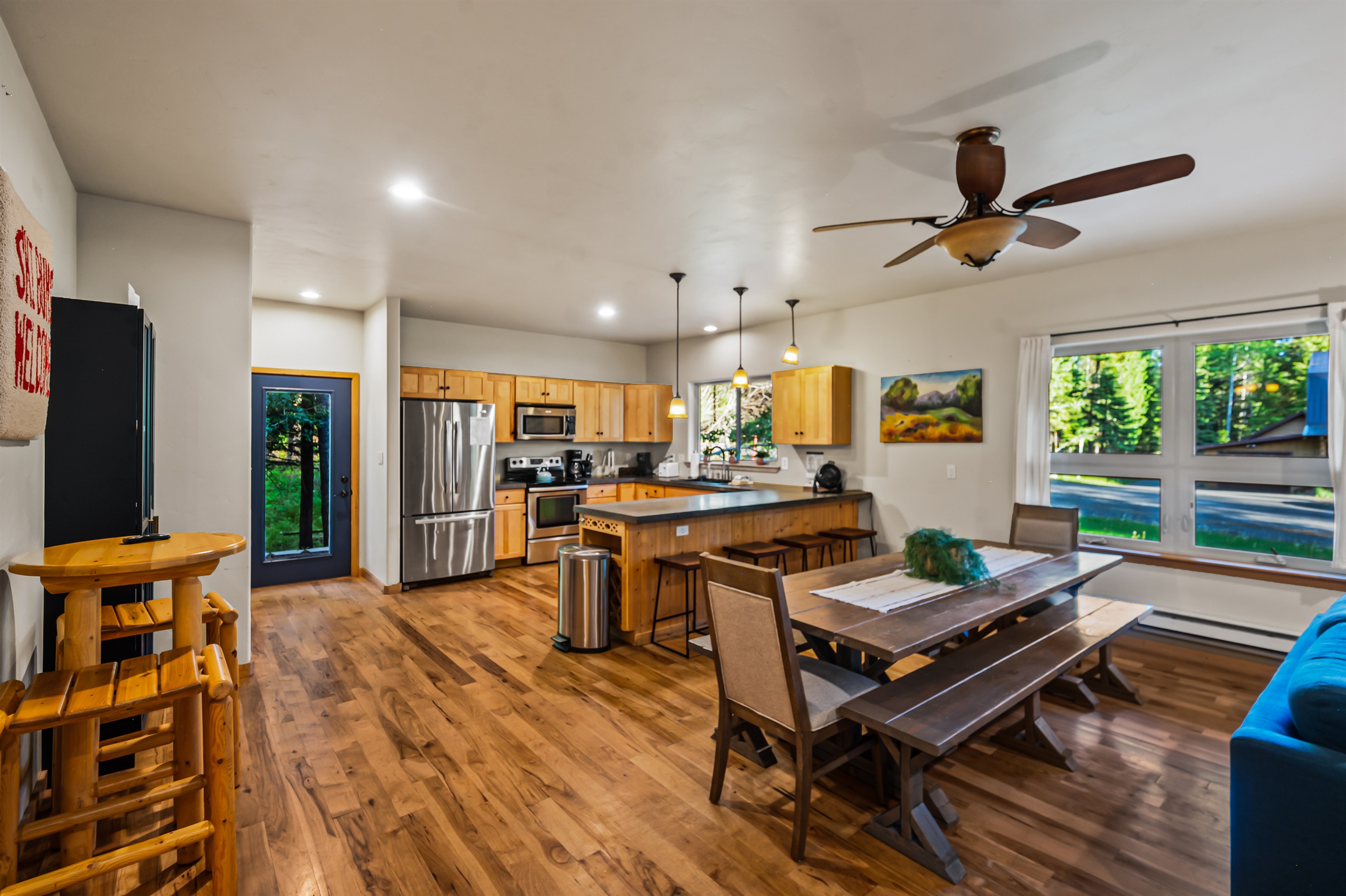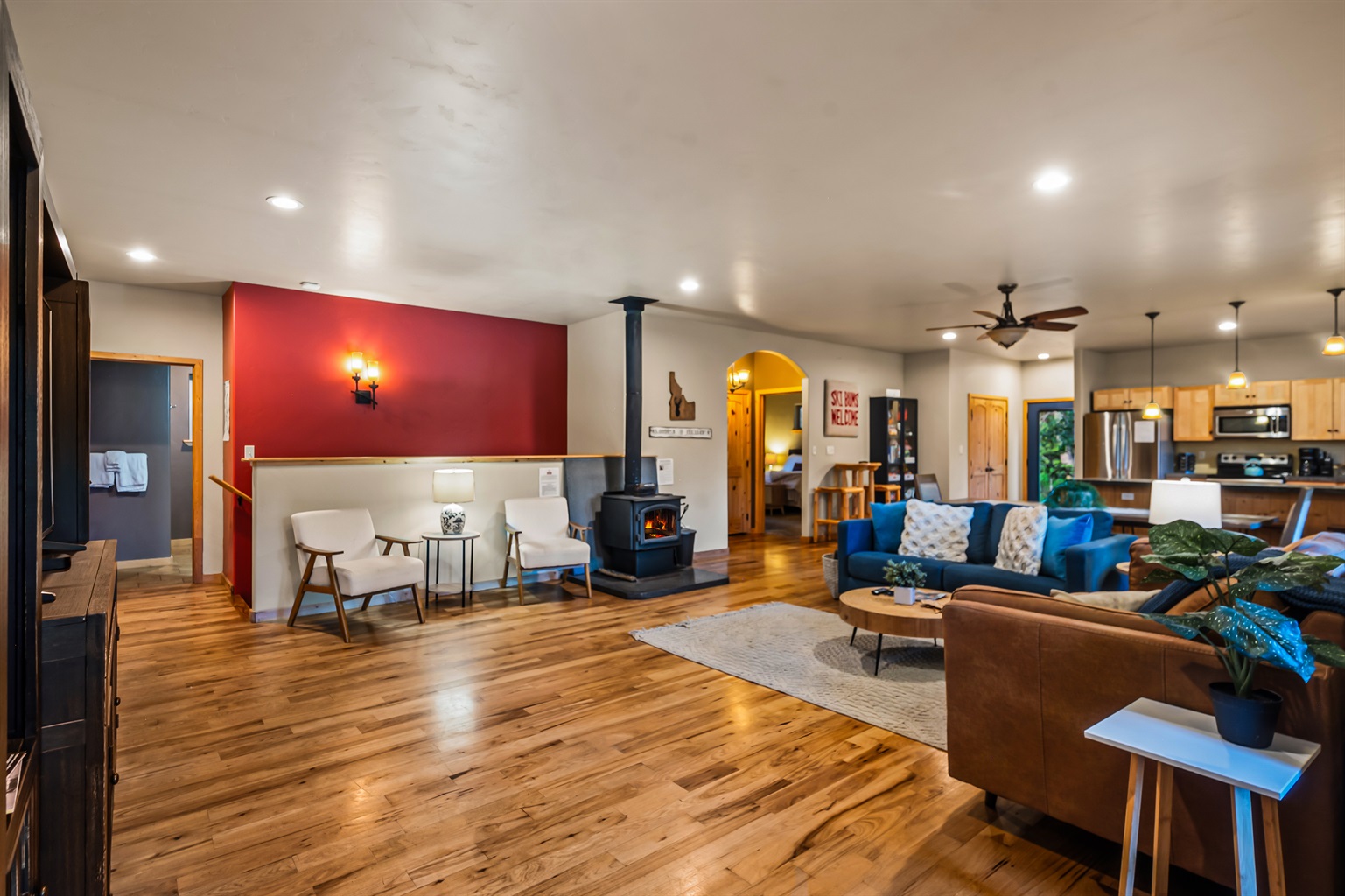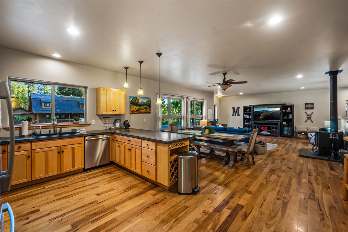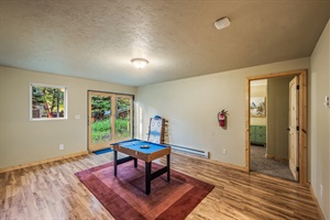 4 Bedrooms • 3 Bathrooms 3 Baths • Sleeps 8-10This delightfully open and modern cabin provides all the comforts of home within easy walking distance of downtown McCall! You can prepare home-cooked meals in the beautiful kitchen, gather around the wood stove and watch movies on snowy winter days, and spend the summer on the spacious outdoor deck that overlooks the surrounding woodlands! You'll even have a basketball arcade game to provide hours of entertainment in the cozy family room, and a Tesla wall connector in the garage to charge at 72 amps. While you're staying here, the house will be your private oasis.